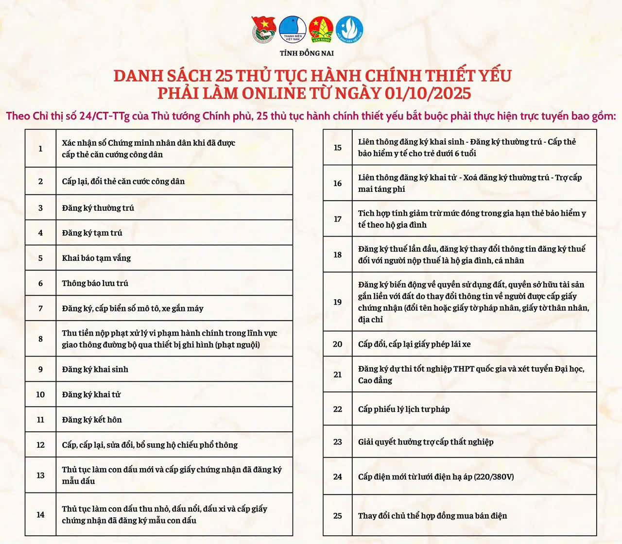 Theo đó, tại Mục 3 Chỉ thị 24/CT-TTg có nêu rõ việc triển khai 25 dịch vụ công trực tuyến toàn trình từ 01/10/2025 như sau: