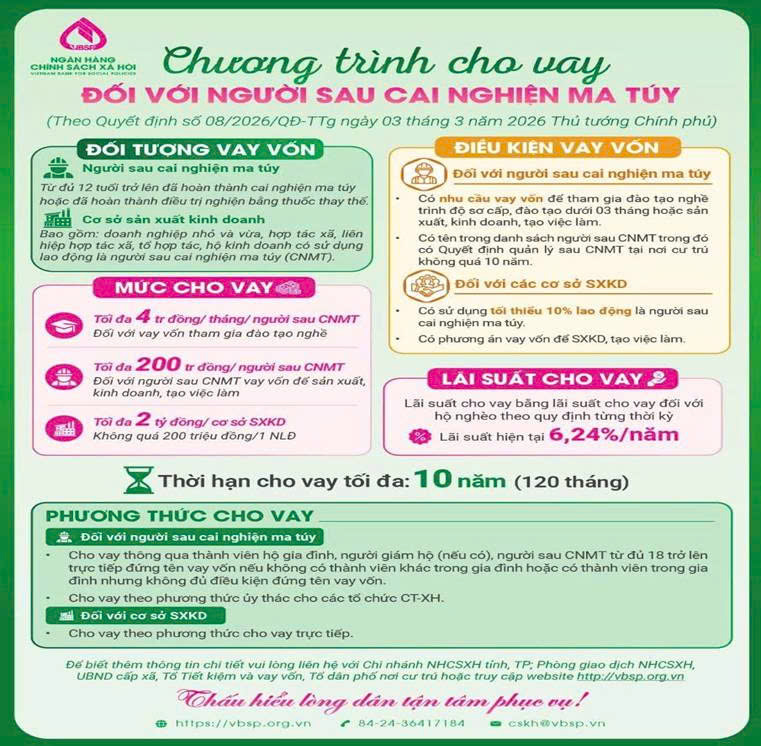 <p style="line-height:normal;margin-bottom:6.0pt;text-align:justify;text-indent:36.0pt;">&nbsp;</p><p style="line-height:normal;margin-bottom:6.0pt;text-align:justify;text-indent:36.0pt;">&nbsp;</p><p style="line-height:normal;margin-bottom:6.0pt;text-align:justify;text-indent:36.0pt;"><span style="font-family:&#039;Times New Roman&#039;,serif;font-size:14.0pt;"><span lang="EN-AU">Ngày 03/3/2026 Chính phủ đã ban hành Quyết định số 08/2026/QĐ-TTg về chính sách tín dụng đối với người sau cai nghiện ma túy. Quyết định có hiệu lực thi hành từ ngày 1/5/2026.</span></span></p><p style="line-height:normal;margin-bottom:6.0pt;text-align:justify;text-indent:36.0pt;"><span style="font-family:&#039;Times New Roman&#039;,serif;font-size:14.0pt;"><span lang="EN-AU">Theo đó, người sau cai nghiện ma túy từ đủ 12 tuổi trở lên đã hoàn thành chương trình cai nghiện tự nguyện, cai nghiện bắt buộc hoặc điều trị nghiện các chất dạng thuốc phiện bằng thuốc thay thế đều có thể tiếp cận nguồn vốn vay ưu đãi tại Ngân hàng Chính sách xã hội.</span></span></p><p style="line-height:normal;margin-bottom:6.0pt;text-align:justify;text-indent:36.0pt;"><span style="font-family:&#039;Times New Roman&#039;,serif;font-size:14.0pt;"><span lang="EN-AU">Nguồn vốn vay được sử dụng để chi phí tham gia đào tạo nghề trình độ sơ cấp hoặc các khóa đào tạo nghề dưới 3 tháng, cũng như phục vụ hoạt động sản xuất, kinh doanh, tạo việc làm cho bản thân và gia đình.&nbsp;</span></span></p><p style="line-height:normal;margin-bottom:6.0pt;text-align:justify;text-indent:36.0pt;"><span style="font-family:&#039;Times New Roman&#039;,serif;font-size:14.0pt;"><span lang="EN-AU">Ngoài ra, các cơ sở sản xuất kinh doanh như doanh nghiệp nhỏ và vừa, hợp tác xã, liên hiệp hợp tác xã, tổ hợp tác hoặc hộ kinh doanh có sử dụng lao động là người sau cai nghiện ma túy cũng được vay vốn để mở rộng sản xuất, tạo thêm việc làm.</span></span></p><p style="line-height:normal;margin-bottom:6.0pt;text-align:justify;text-indent:36.0pt;"><span style="font-family:&#039;Times New Roman&#039;,serif;font-size:14.0pt;"><span lang="EN-AU">Lãi suất cho vay được áp dụng bằng lãi suất cho vay đối với hộ nghèo theo từng thời kỳ. Trường hợp khoản vay quá hạn, lãi suất nợ quá hạn sẽ bằng 130% lãi suất cho vay.</span></span></p><figure class="image"><img style="aspect-ratio:761/746;" src="https://budang.dongnai.gov.vn/uploads/budang/news/2026_04/z7754328069072_4939ec873aa701acb67a82725f1b9ef6_1.jpg" width="761" height="746" /></figure><p style="line-height:normal;margin-bottom:6.0pt;text-align:justify;text-indent:36.0pt;"><span style="font-family:&#039;Times New Roman&#039;,serif;font-size:14.0pt;"><span lang="EN-AU"><strong>Theo quyết định, mức cho vay đối với người sau cai nghiện ma túy được quy định cụ thể như sau:</strong></span></span></p><p style="line-height:normal;margin-bottom:6.0pt;text-align:justify;text-indent:36.0pt;"><span style="font-family:&#039;Times New Roman&#039;,serif;font-size:14.0pt;"><span lang="EN-AU">- Đối với vay vốn để tham gia đào tạo nghề trình độ sơ cấp hoặc đào tạo dưới 3 tháng, mức cho vay tối đa bằng mức cho vay theo chính sách tín dụng đối với học sinh, sinh viên, hiện áp dụng tối đa 4 triệu đồng mỗi tháng cho một người.</span></span></p><p style="line-height:normal;margin-bottom:6.0pt;text-align:justify;text-indent:36.0pt;"><span style="font-family:&#039;Times New Roman&#039;,serif;font-size:14.0pt;"><span lang="EN-AU">- Đối với vay vốn để sản xuất, kinh doanh và tạo việc làm, mức cho vay tối đa là 200 triệu đồng đối với mỗi người sau cai nghiện ma túy.&nbsp;</span></span></p><p style="line-height:normal;margin-bottom:6.0pt;text-align:justify;text-indent:36.0pt;"><span style="font-family:&#039;Times New Roman&#039;,serif;font-size:14.0pt;"><span lang="EN-AU">- Trường hợp người vay đang có dư nợ từ các chương trình cho vay hỗ trợ tạo việc làm hoặc các chương trình cho vay cá nhân khác tại Ngân hàng Chính sách xã hội, tổng dư nợ của các khoản vay có cùng mục đích không được vượt quá 200 triệu đồng cho mỗi người.</span></span></p><p style="line-height:normal;margin-bottom:6.0pt;text-align:justify;text-indent:36.0pt;"><span style="font-family:&#039;Times New Roman&#039;,serif;font-size:14.0pt;"><span lang="EN-AU">- Đối với cơ sở sản xuất kinh doanh có sử dụng lao động là người sau cai nghiện ma túy, mức cho vay tối đa là 2 tỷ đồng cho mỗi cơ sở và không quá 200 triệu đồng cho mỗi lao động thuộc nhóm đối tượng này.</span></span></p><p style="line-height:normal;margin-bottom:6.0pt;text-align:justify;text-indent:36.0pt;"><span style="font-family:&#039;Times New Roman&#039;,serif;font-size:14.0pt;"><span lang="EN-AU">- Để được vay vốn, người sau cai nghiện ma túy phải chấp hành tốt quy định của pháp luật và có tên trong danh sách quản lý người sau cai nghiện tại địa phương do công an cấp xã lập và được UBND cấp xã xác nhận. Thời gian tính từ khi ban hành quyết định quản lý sau cai nghiện đến thời điểm vay vốn không quá 10 năm.</span></span></p><p style="line-height:normal;margin-bottom:6.0pt;text-align:justify;text-indent:36.0pt;"><span style="font-family:&#039;Times New Roman&#039;,serif;font-size:14.0pt;"><span lang="EN-AU">- Đối với trường hợp vay vốn để học nghề, người vay phải tất toán dư nợ trước đ